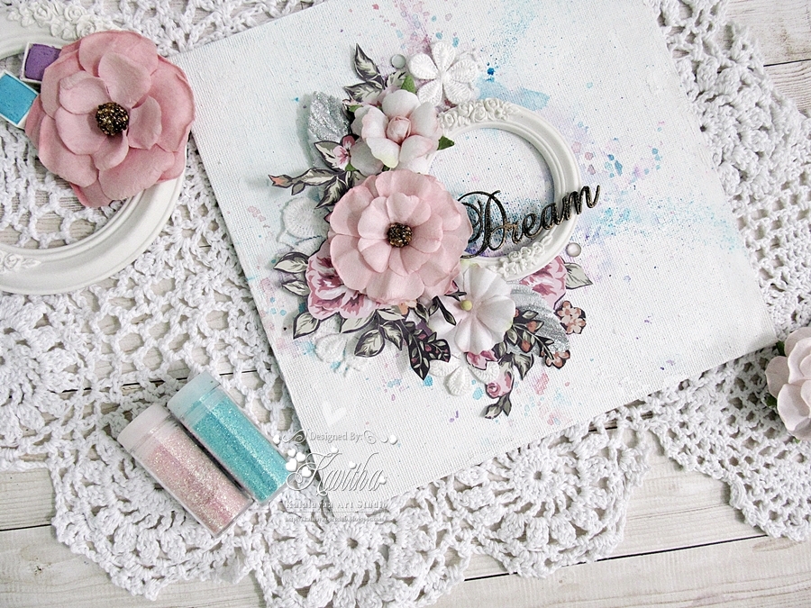 Hello everyone,i am so happy to be back as guest designer once again here.As usual the mood board is very inspiring,but what caught my eye more is the simple and beautiful sketch and the circle elements.I love adding layers,but inspired by the sketch i made a minimalist design on canvas with lots of white space and light water color background.Using a beautiful resin frame as focal point,i added few prima flowers,fussy cut flowers and some laces and its done