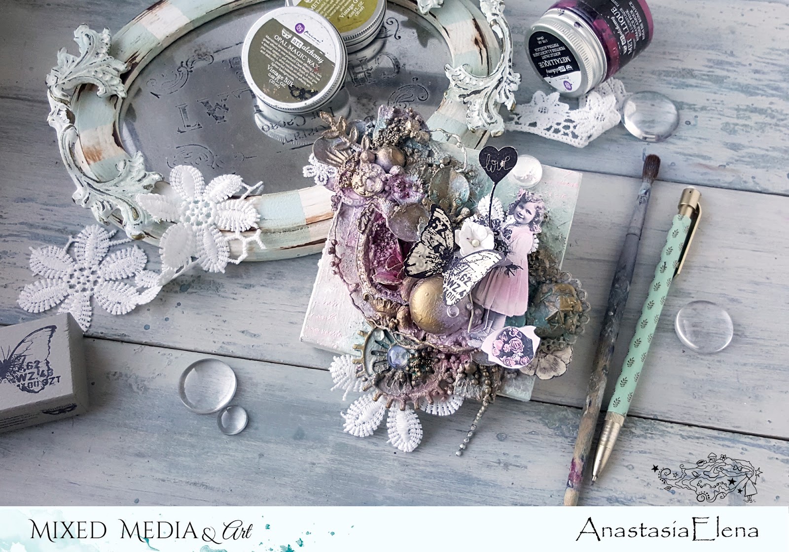 Основа работы - деревянный планшет. В качестве декора я использовала металлюшки - звездочки, шестеренки, цветы; Art Pebbles, Art Stones и микробисер(Finnabair); также проволоку, кружево, гипсовую рамочку и вырезанные штампы Prima и Finnabair. Красила акриловыми красками, разбавленными белым гессо, мэджиками Lindy's и восками Finnabair.