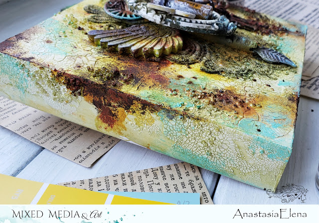 Hello everyone! Each our moodboard is the expectation which element will work as an inspirer, but always the color palette inspiring me. And this time rich yellow with a drop of light blue did not leave me indifferent.And it was a surprise for me - I supposed my work will be about Summer but turned out abstract work about the time)). As usual for this work I used my favorite Finnabair Studio products and Lindy's Gang magical powders.
